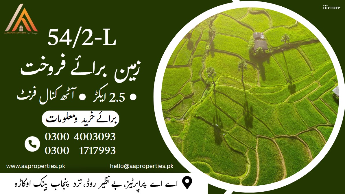 2.5 acre agricultural land for sale in 54/2-L Okara with 8 kanal front. Ideal for farming or long-term investment.Prime Location – Near Main Road