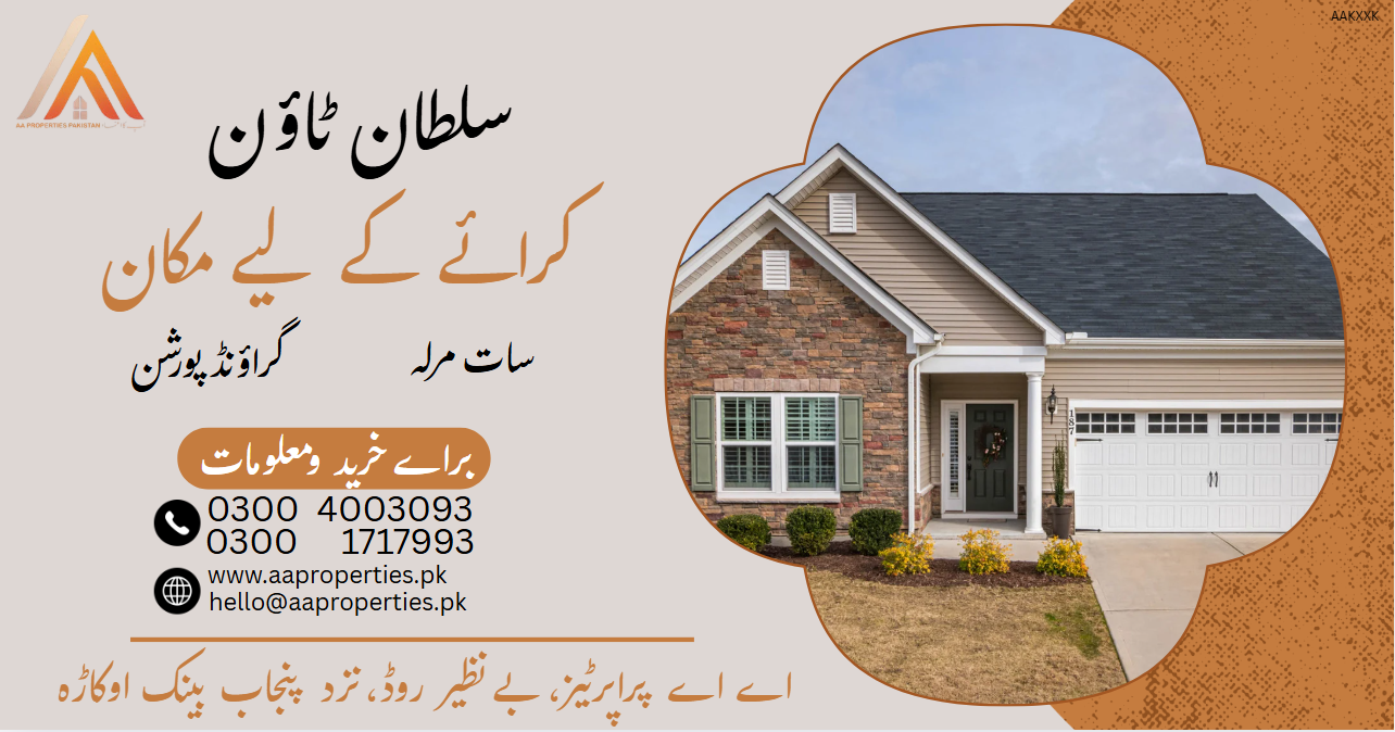 AA Properties presents a stunning 7 Marla residential house available for rent in the prestigious Sultan Town, Okara. This property is ideal for a family seeking a blend of modern architecture and a peaceful neighborhood.
