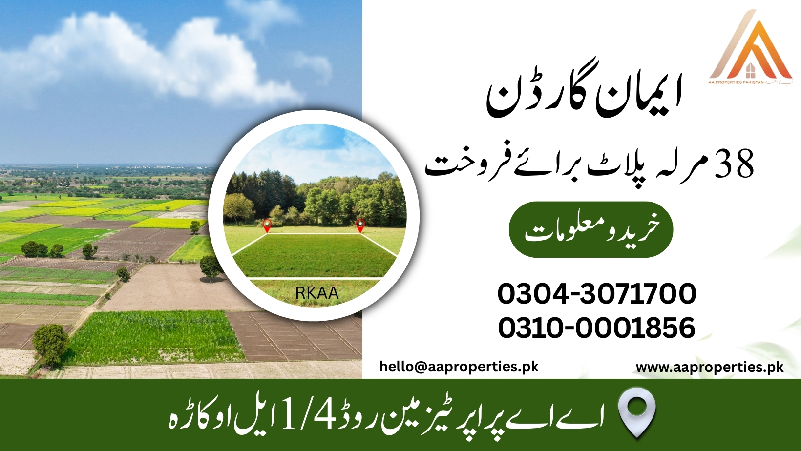 Build your dream estate on this massive 38 Marla plot in Eman Garden. Premium location, secure environment, and unbeatable value at just 4.5 Lac per Marla.