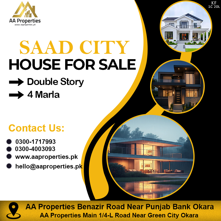 - Modern 4 Marla double-story house for sale in Saad City, Okara. Featuring a spacious layout, quality finishes, and a secure environment. Perfect for families!