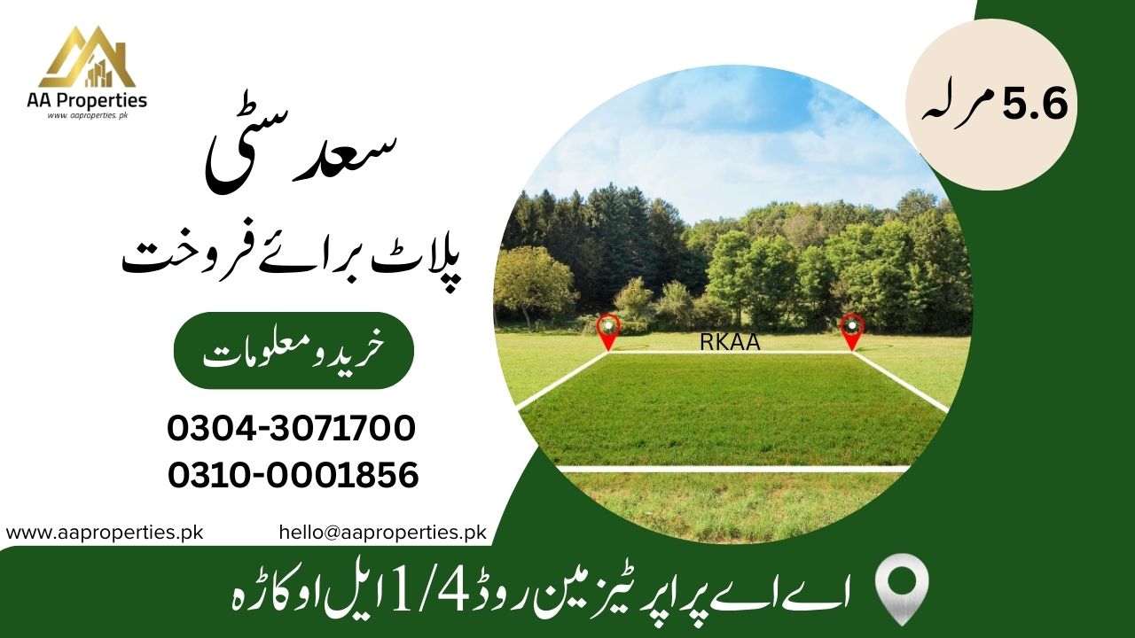 Secure this 5 Marla 6 Sarsai plot in Saad City, Okara. Prime location, 7.5 Lac/Marla. Total price: 42.45 Lac. Perfect for your dream home.